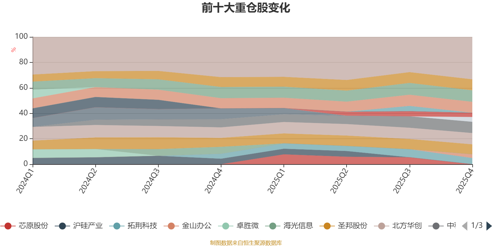 该基金持股集中度较高,近2年前十大重仓股集中度长期超过60%。截至2025年末,基金十大重仓股分别是中芯国际、北方华创、中科飞测、中微公司、华大九天、圣邦股份、拓荆科技、传音控股、芯源微、金山办公。