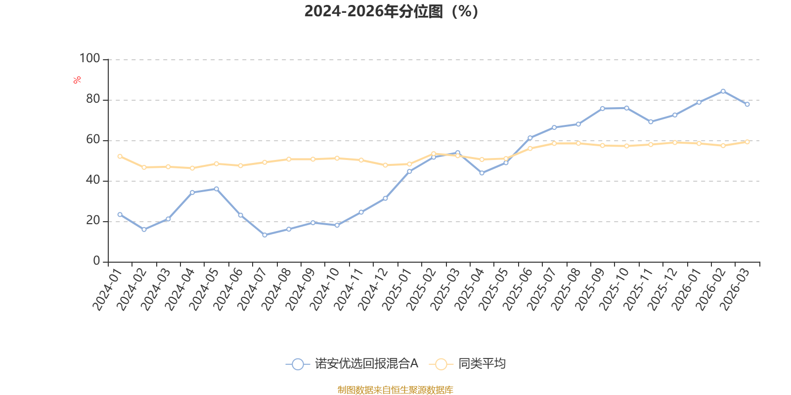 通过所选区间该基金净值增长率分位图,可以观察该基金与同类基金业绩比较情况。图为坐标原点到区间内某时点的净值增长率在同类基金中的分位数。