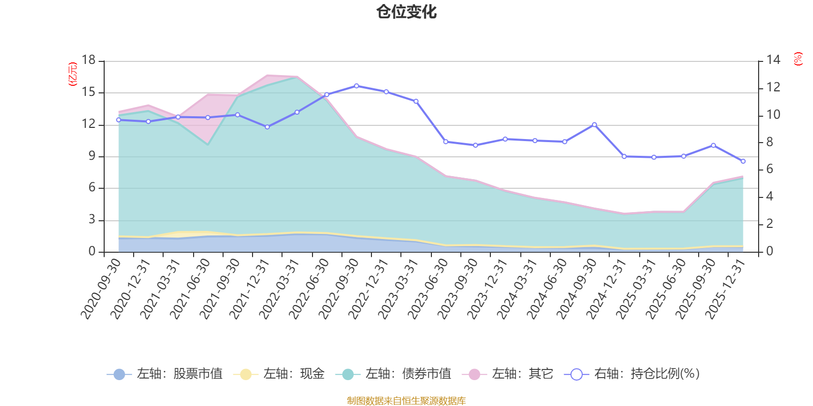 据定期报告数据统计,近三年平均股票仓位为8.02%,同类平均为19.2%。2022年三季度末基金达到12.17%的最高仓位,2025年末最低,为6.65%。