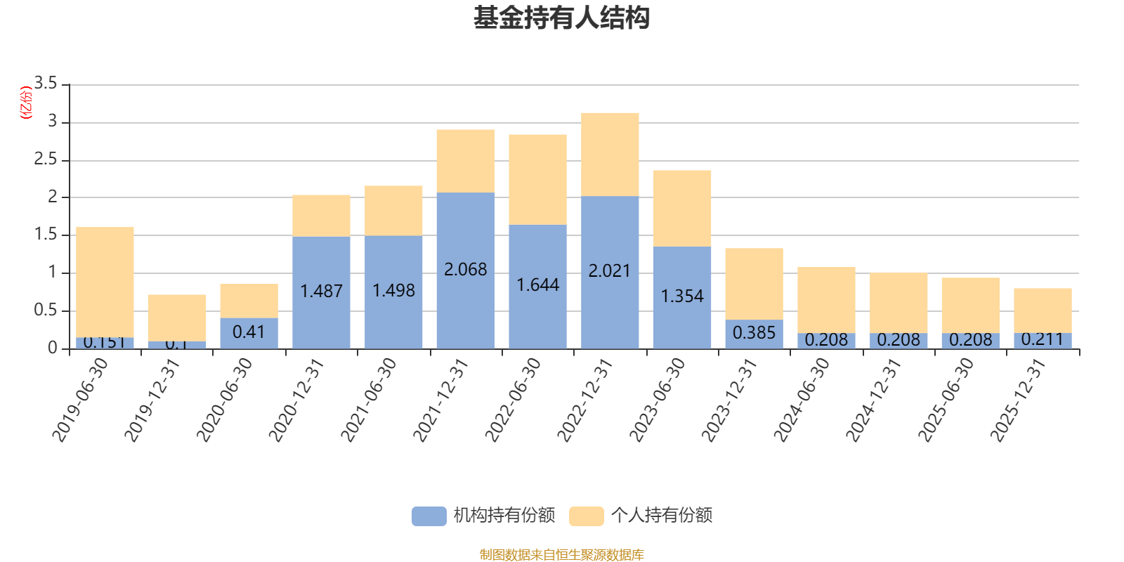截至2025年12月31日,基金持有人共计2229户,合计持有8000.27万份。其中管理人员工持有35.77万份,占比0.45%,机构持有份额占比26.32%,个人投资者占比73.68%。