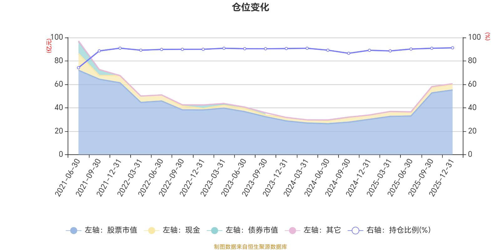 据定期报告数据统计,近三年平均股票仓位为89.87%,同类平均为86.9%。2025年末基金达到91.18%的最高仓位,2021年上半年末最低,为74.2%。