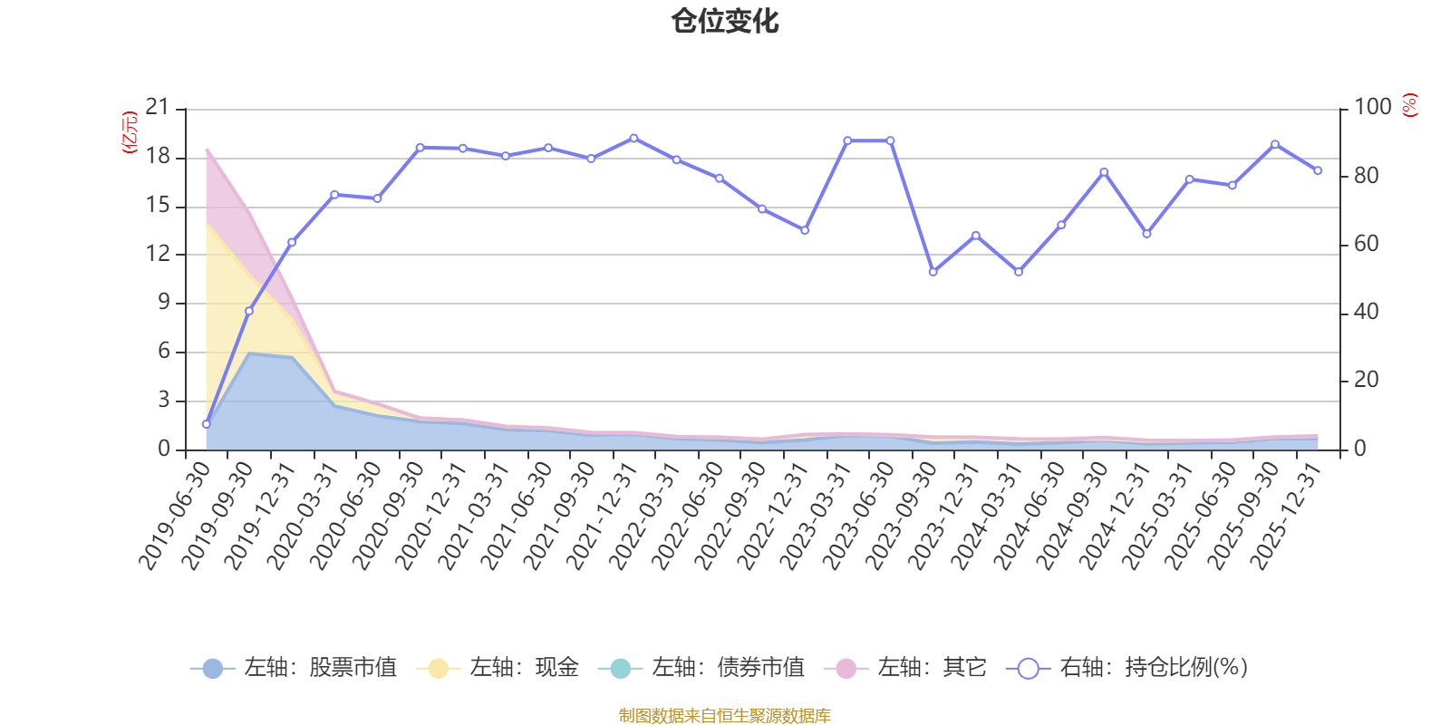 据定期报告数据统计,近三年平均股票仓位为73.98%,同类平均为84.04%。2021年末基金达到91.39%的最高仓位,2019年上半年末最低,为7.57%。
