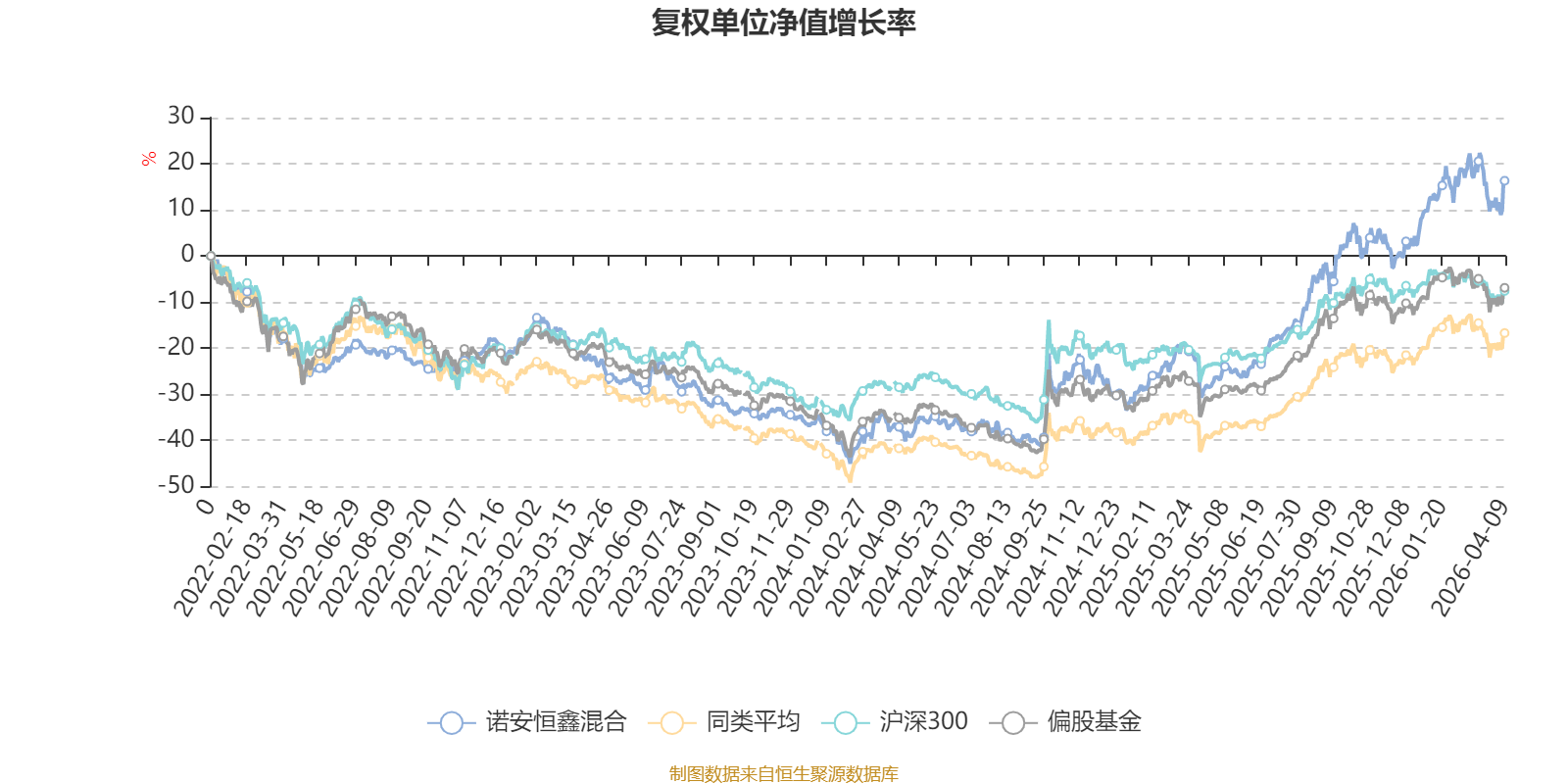截至4月9日,诺安恒鑫混合近三个月复权单位净值增长率为2.60%,位于同类可比基金184/689;近半年复权单位净值增长率为8.60%,位于同类可比基金172/689;近一年复权单位净值增长率为66.55%,位于同类可比基金106/685;近三年复权单位净值增长率为49.84%,位于同类可比基金44/417。