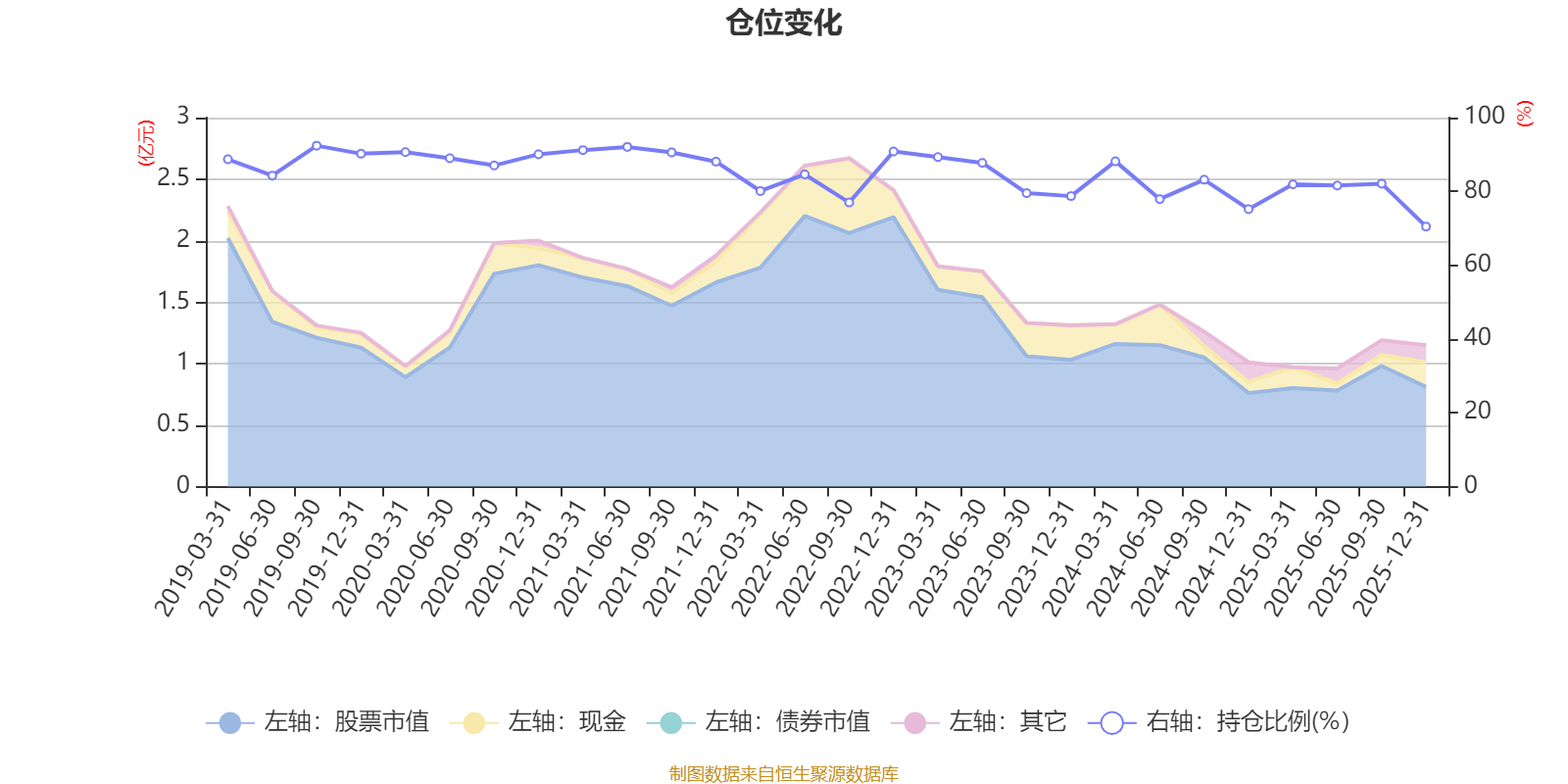 据定期报告数据统计,近三年平均股票仓位为81.31%,同类平均为72.57%。2019年三季度末基金达到92.39%的最高仓位,2025年末最低,为70.47%。