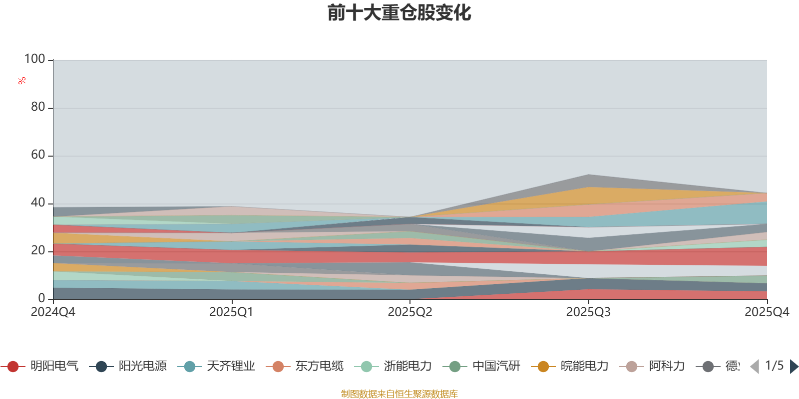 截至2025年末,基金十大重仓股分别是宏发股份、宁德时代、尚太科技、璞泰来、阳光电源、科达利、明阳电气、天赐材料、中国汽研、景津装备。