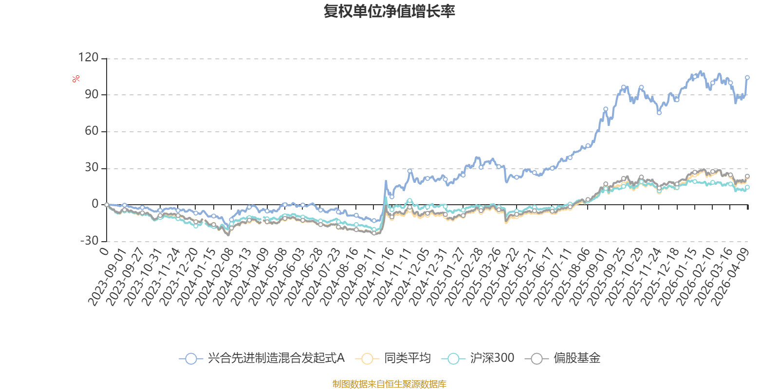 截至4月9日,兴合先进制造混合发起式A近三个月复权单位净值增长率为0.10%,位于同类可比基金279/689;近半年复权单位净值增长率为3.62%,位于同类可比基金291/689;近一年复权单位净值增长率为70.53%,位于同类可比基金89/685。