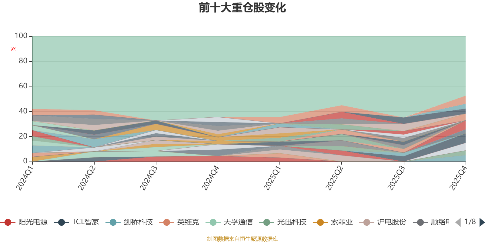 截至2025年末,基金十大重仓股分别是中微公司、工业富联、海光信息、新宙邦、星网锐捷、剑桥科技、拓普集团、生益科技、光迅科技、宁德时代。