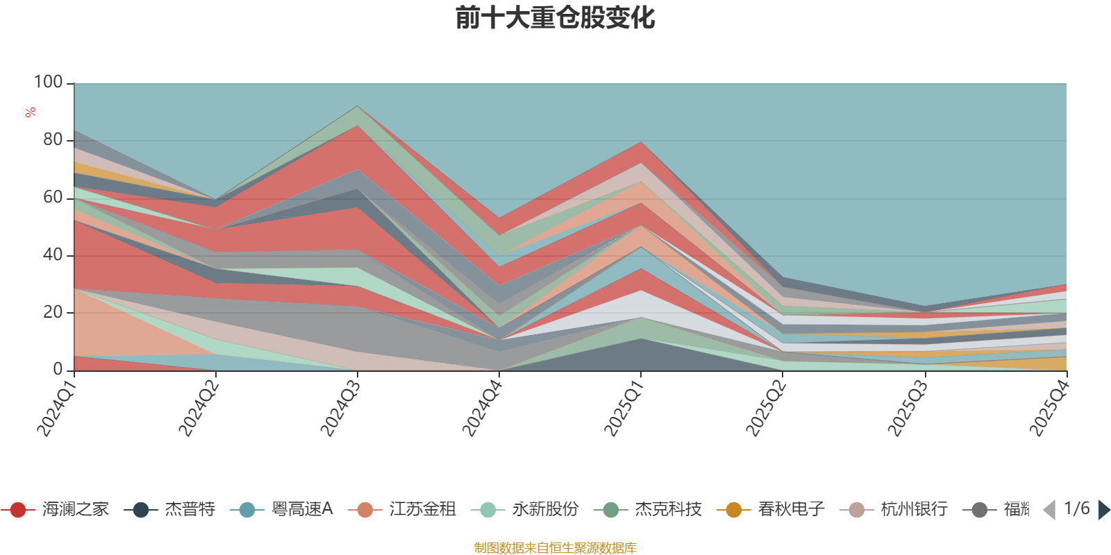 截至2025年末,基金十大重仓股分别是峨眉山A、春秋电子、伟明环保、宝丰能源、久立特材、分众传媒、新和成、海天味业、中国人保、梅花生物。
