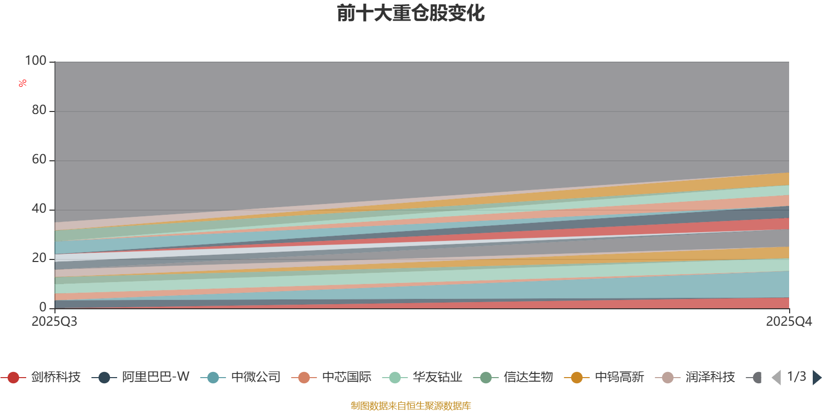截至2025年末,基金十大重仓股分别是中微公司、工业富联、华友钴业、海光信息、泡泡玛特、中钨高新、星网锐捷、生益科技、剑桥科技、中国铝业。