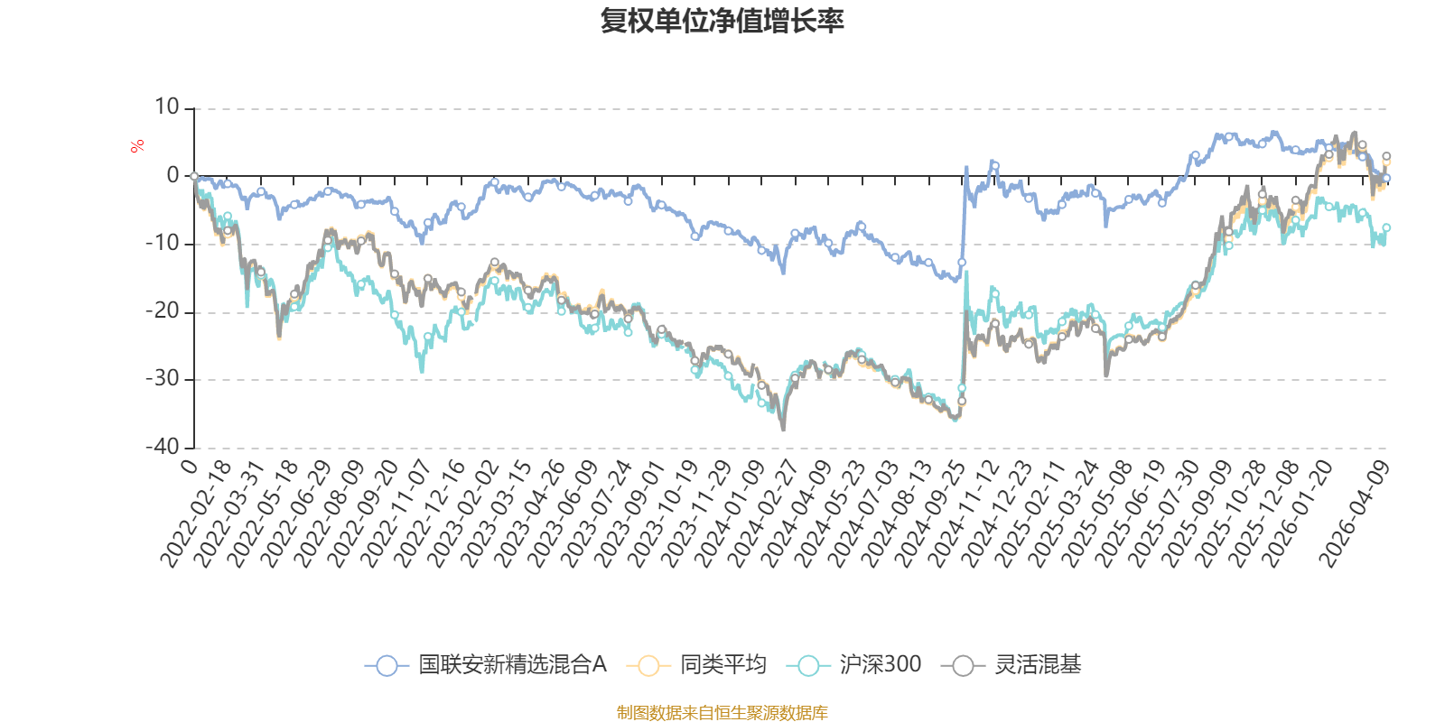 截至4月9日,国联安新精选混合A近三个月复权单位净值增长率为-5.01%,位于同类可比基金1005/1287;近半年复权单位净值增长率为-5.40%,位于同类可比基金1060/1286;近一年复权单位净值增长率为5.35%,位于同类可比基金1148/1286;近三年复权单位净值增长率为0.41%,位于同类可比基金958/1286。