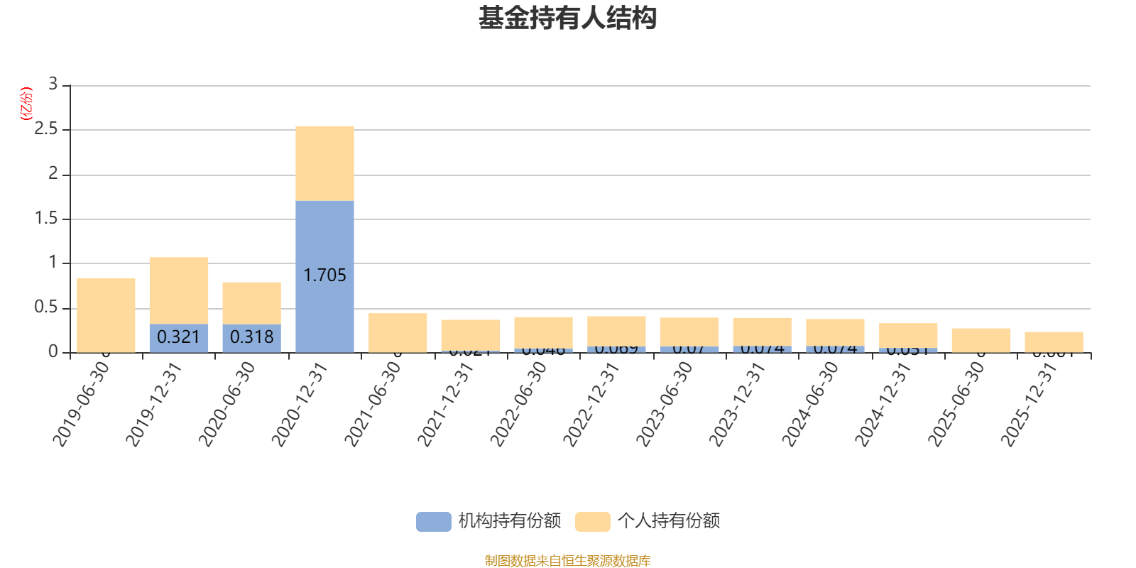 截至2025年12月31日,基金持有人共计983户,合计持有2304.52万份。其中管理人员工持有12.73万份,占比0.55%,机构持有份额占比0.50%,个人投资者占比99.50%。