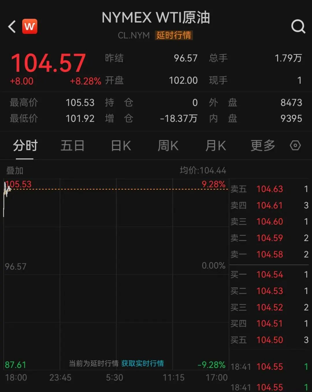 【大河财立方消息】4月13日,WTI原油期货开盘大涨,盘中突破105美元/桶,日内涨幅扩大至超9%。