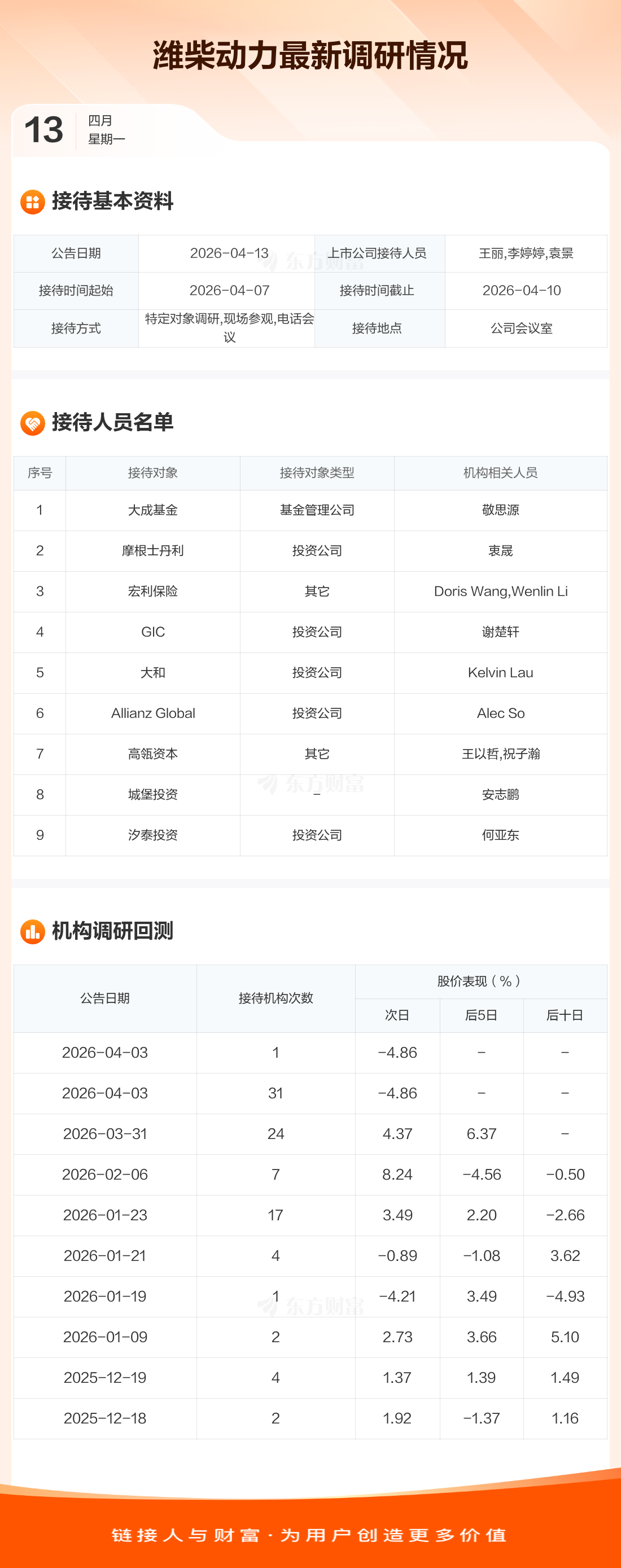 潍柴动力4月13日公告称,4月7日至4月10日接待大成基金等9家机构调研。接待人员包括王丽,李婷婷,袁景。