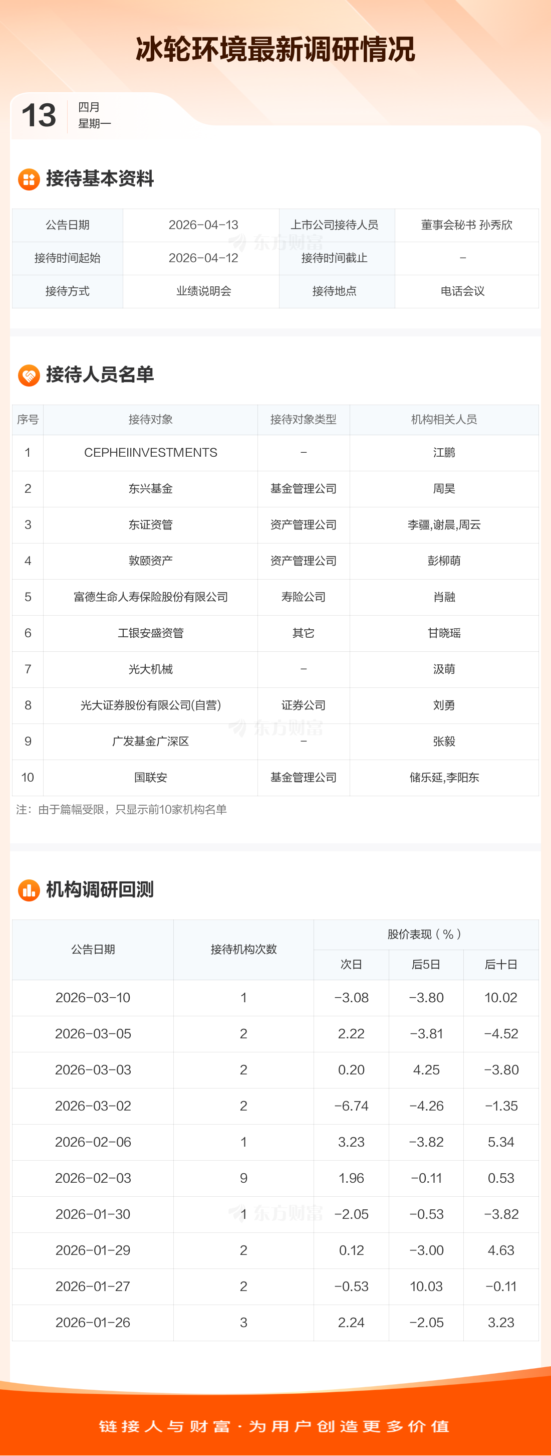 冰轮环境4月13日公告称,4月12日接待CEPHEIINVESTMENTS等75家机构调研。接待人员包括董事会秘书 孙秀欣。