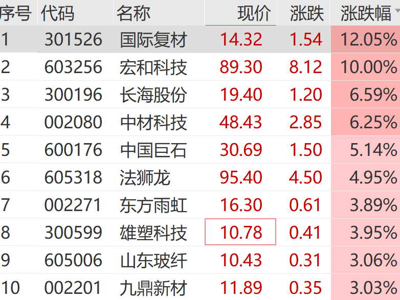 建材板块同步走强,玻纤概念股火热。宏和科技涨停,总市值站上800亿元。国际复材涨超10%,长海股份、中国巨石等纷纷大涨。