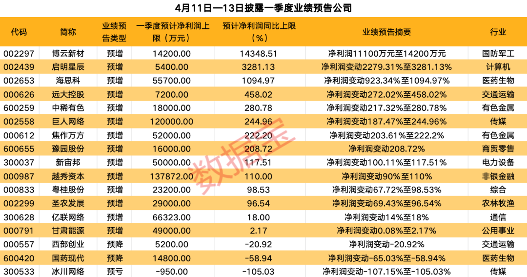 4月11—13日共有17家公司发布一季度业绩预告,以业绩预告类型统计,预增有14家,按预计净利润增幅上限统计,博云新材(002297)预计净利润增幅居首,公司预计一季度盈利1.11亿元至1.42亿元,同比增长11194.26%~14348.51%,公司表示,报告期内,在硬质合金产品的主要原材料碳化钨价格持续上涨的背景下,公司硬质合金产品整体实现量价齐升,使得硬质合金板块的收入及毛利率均有大幅增长。