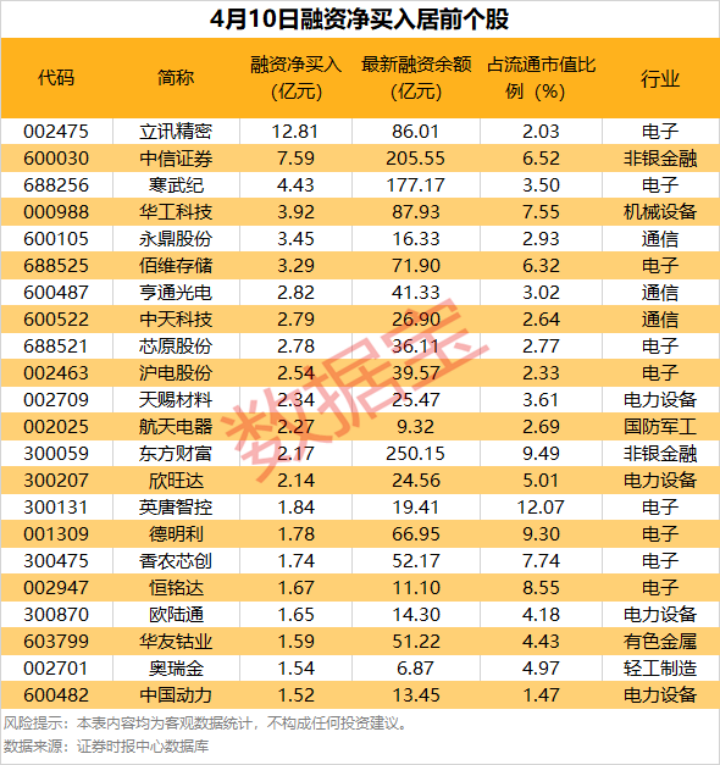 具体到个股,4月10日共有1525只股获融资净买入,净买入金额在1亿元以上的有41只,其中6只融资净买入额超3亿元。立讯精密融资净买入额居首,当日净买入12.81亿元,其次是中信证券、寒武纪,融资净买入金额分别为7.59亿元、4.43亿元,融资净买入金额居前的还有华工科技、永鼎股份、佰维存储等。