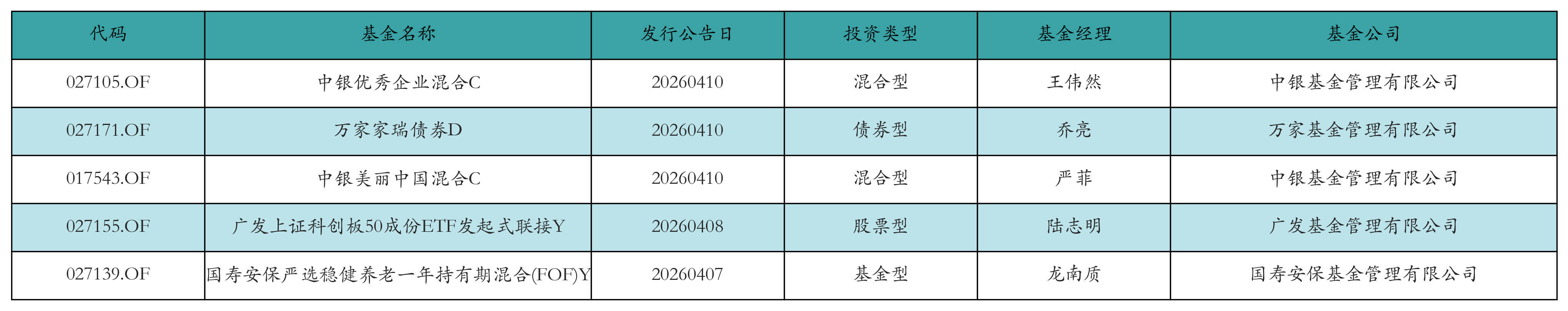 上周有5只新基金发行,分别为:中银优秀企业混合C、万家家瑞债券D、中银美丽中国混合C、广发上证科创板50成份ETF发起式联接Y、国寿安保严选稳健养老一年持有期混合(FOF)Y,详情见下表: