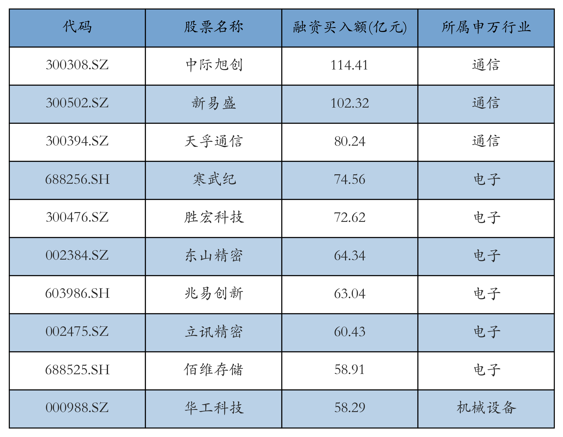 上周两市共有3489只个股有融资资金买入,共有130只个股买入金额超10亿元,其中中际旭创、新易盛、天孚通信排名前三,买入金额分别114.41亿元、102.32亿元、80.24亿元。融资买入额前10个股详情见下表: