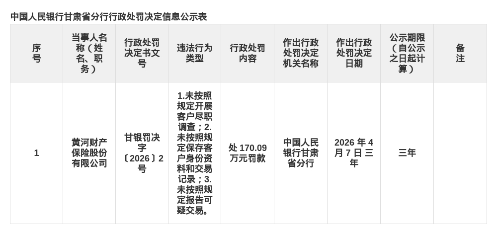 黄河财险被罚170.09万,涉未按规定开展客户尽职调查等