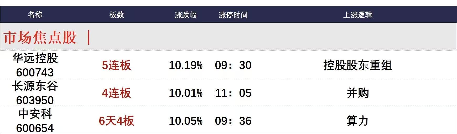 今日午盘全市场共41股涨停,连板股总数7只,13股封板未遂,封板率为76%(不含ST股、退市股)。焦点股方面,并购重组的华远控股5连板、长源东谷4连板,算力板块中安科6天4板。