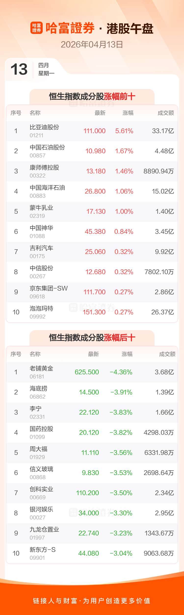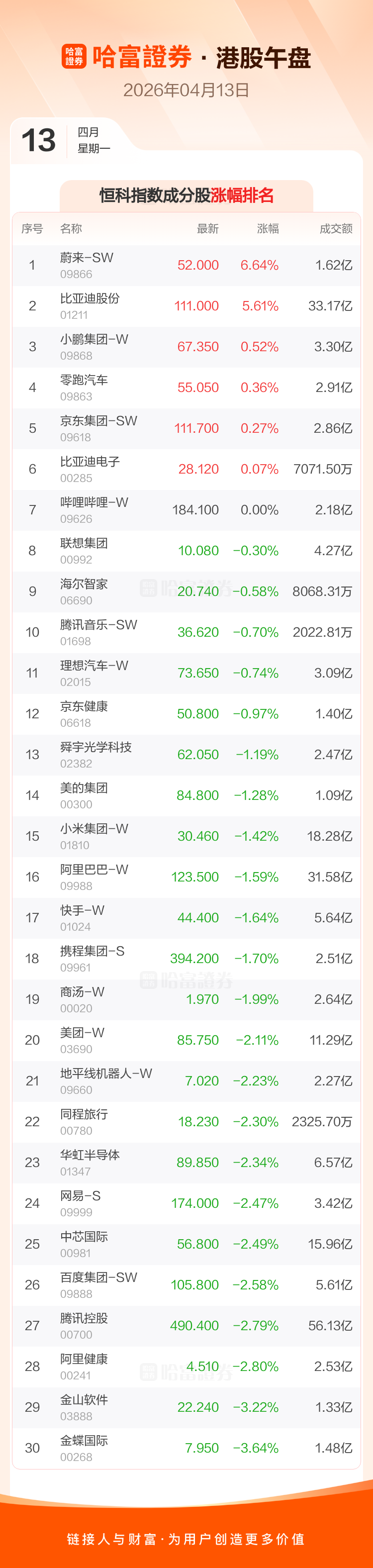 港股4月13日午盘走低,恒生指数收报25587.26点,跌306.28点,跌幅1.18%;恒生科技指数收报4812.94点,跌47.32点,跌幅0.97%。恒生指数成分股中比亚迪股份、中国石油股份、康师傅控股涨幅居前,老铺黄金、海底捞、李宁跌幅靠前。恒生科技指数成分股中蔚来-SW、比亚迪股份、小鹏集团-W涨幅居前,金蝶国际、金山软件、阿里健康跌幅靠前。