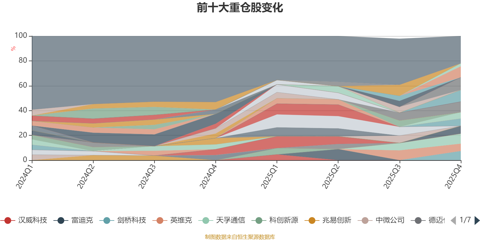 截至2025年末,基金重仓股分别是中际旭创、长芯博创、胜宏科技、新易盛、天孚通信、剑桥科技、源杰科技、华虹半导体、英维克、合合信息、华虹公司。