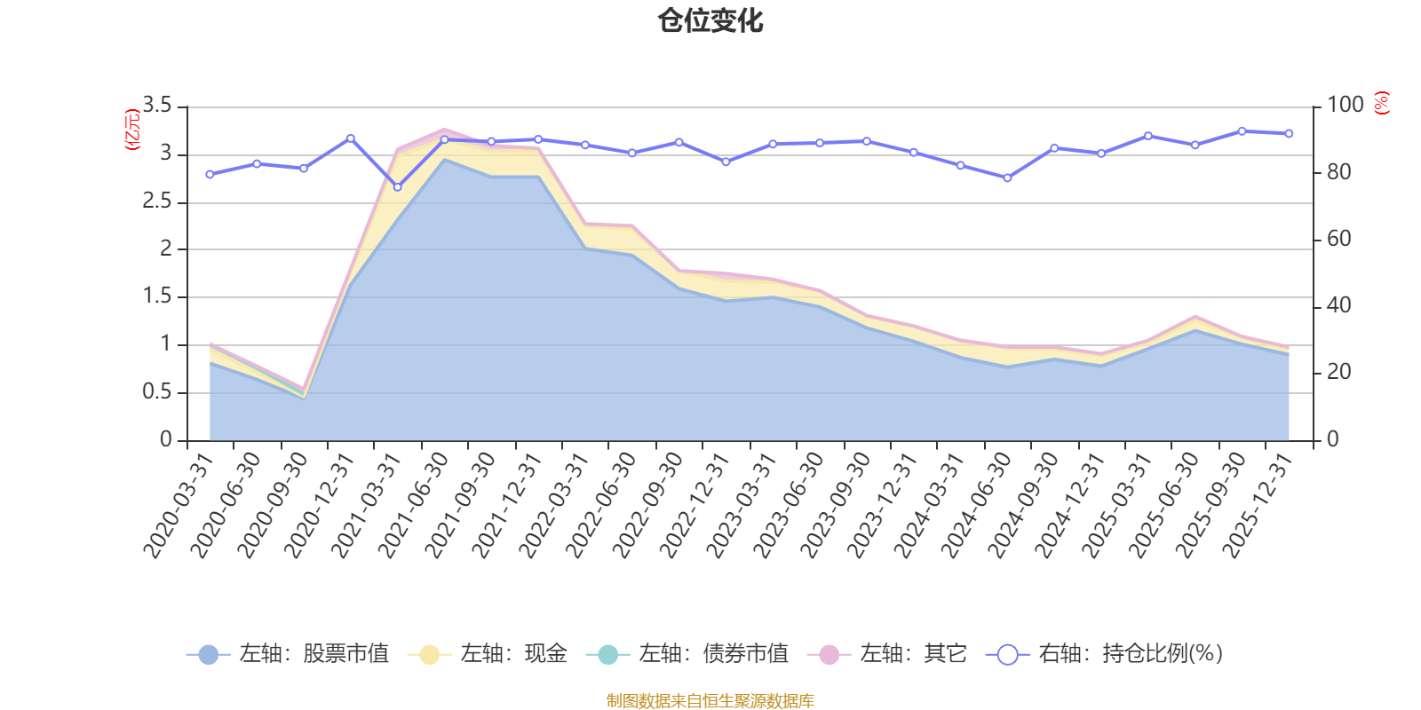 据定期报告数据统计,近三年平均股票仓位为87.71%,同类平均为84.04%。2025年三季度末基金达到92.62%的最高仓位,2021年一季度末最低,为75.87%。