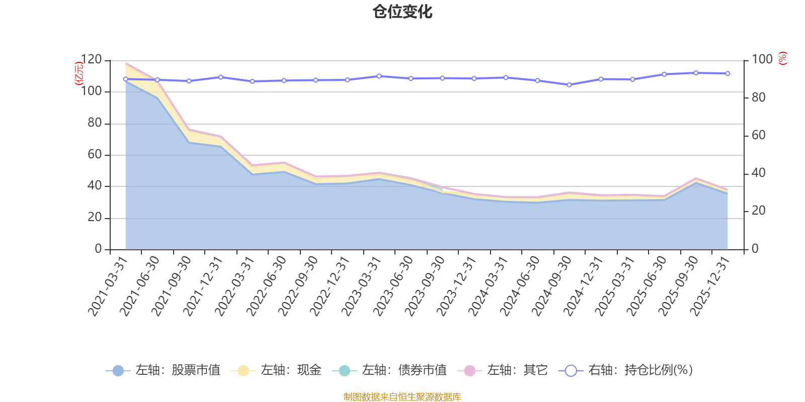 据定期报告数据统计,近三年平均股票仓位为90.77%,同类平均为86.9%。2025年三季度末基金达到93.38%的最高仓位,2024年三季度末最低,为87.07%。