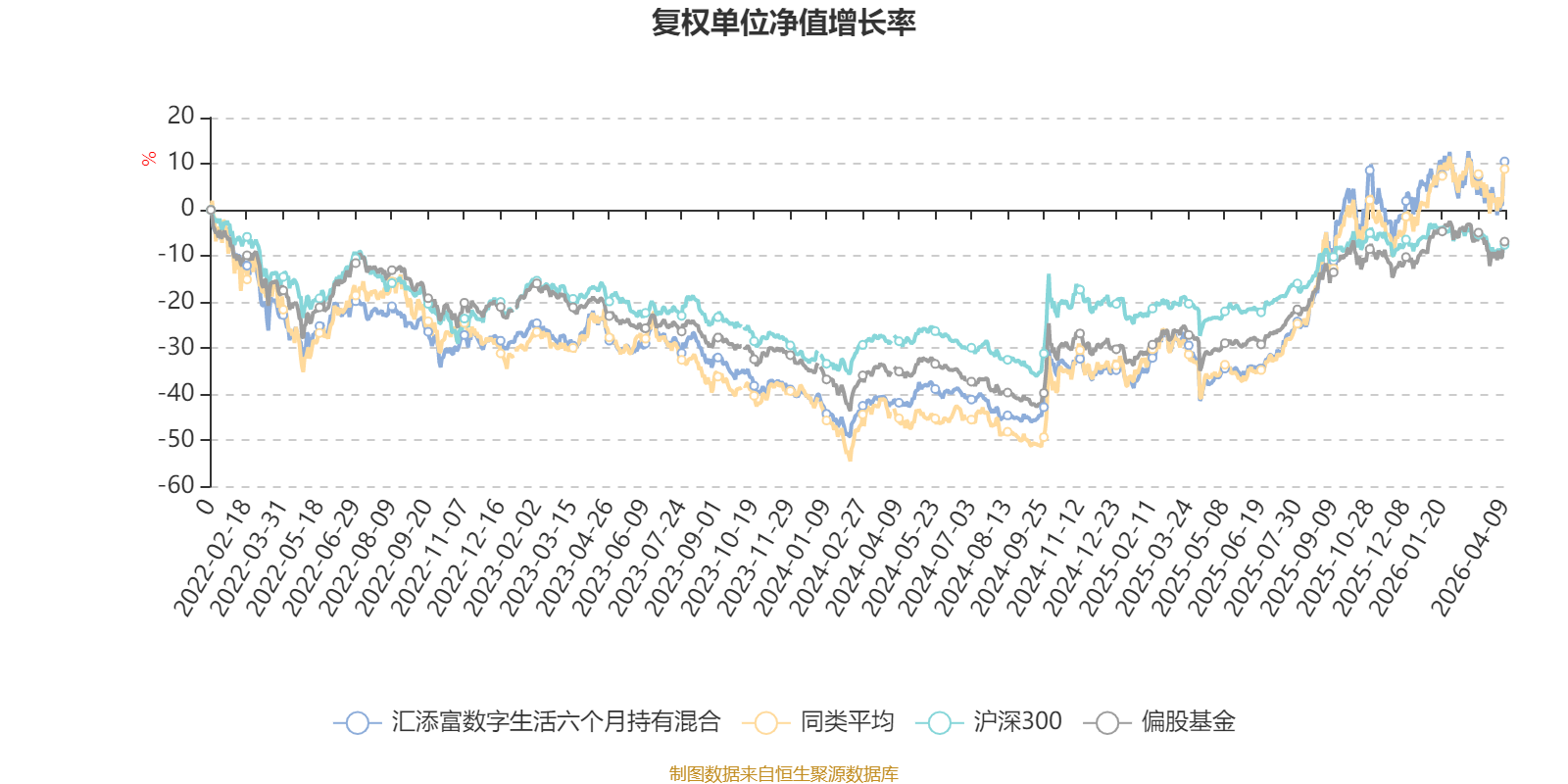 截至4月9日,汇添富数字生活六个月持有混合近三个月复权单位净值增长率为3.80%,位于同类可比基金86/229;近半年复权单位净值增长率为5.72%,位于同类可比基金106/229;近一年复权单位净值增长率为82.11%,位于同类可比基金90/229;近三年复权单位净值增长率为41.45%,位于同类可比基金89/171。