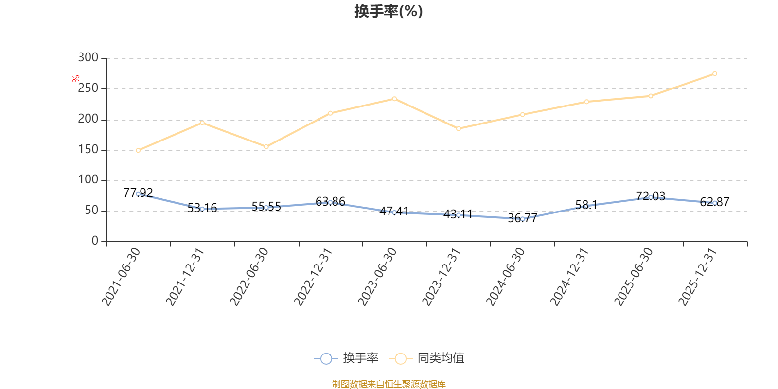 截至2025年12月31日,基金最近一年换手率约132.34%,持续低于同类均值。