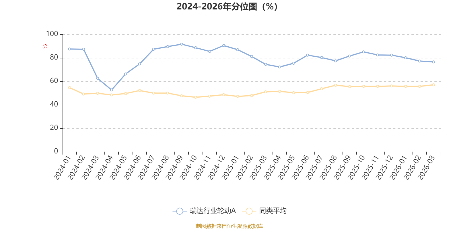 通过所选区间该基金净值增长率分位图,可以观察该基金与同类基金业绩比较情况。图为坐标原点到区间内某时点的净值增长率在同类基金中的分位数。