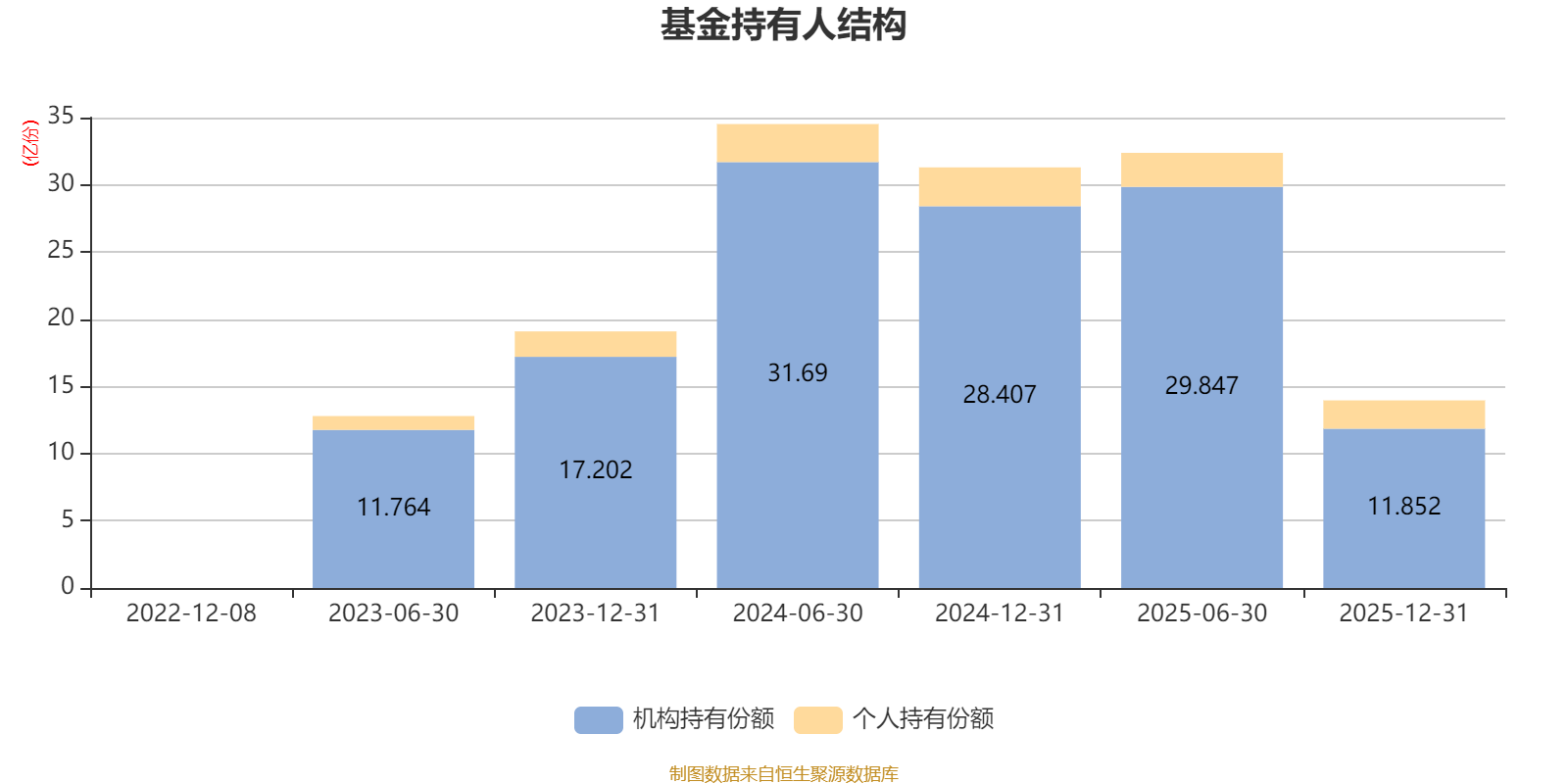 截至2025年12月31日,基金持有人共计3.57万户,合计持有13.96亿份。其中管理人员工持有830.63万份,占比0.59%,机构持有份额占比84.90%,个人投资者占比15.10%。