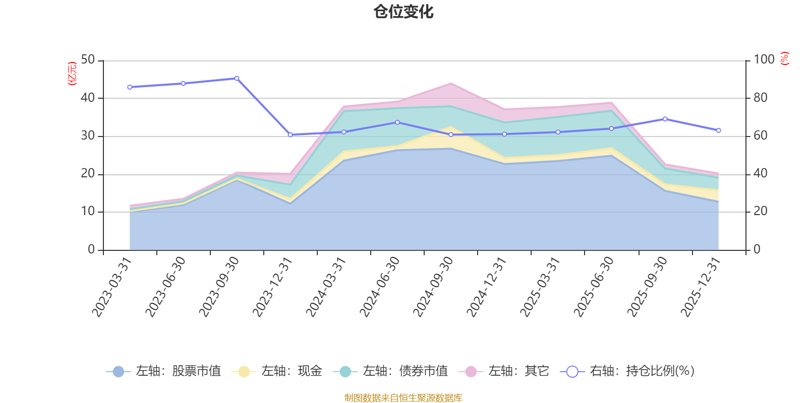 据定期报告数据统计,近三年平均股票仓位为69.63%,同类平均为86.17%。2023年三季度末基金达到90.56%的最高仓位,2023年末最低,为60.83%。