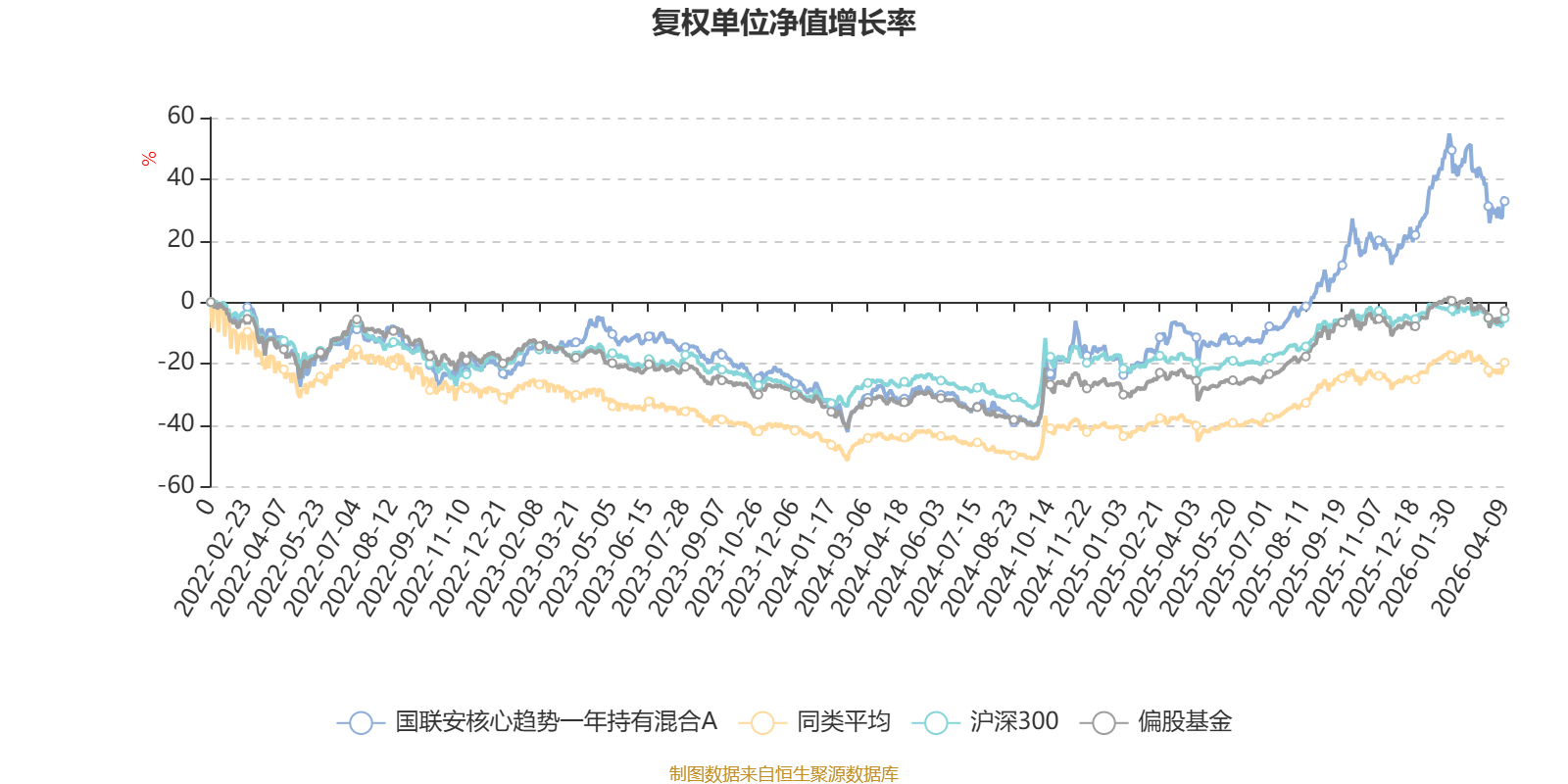 截至4月9日,国联安核心趋势一年持有混合A近三个月复权单位净值增长率为-4.15%,位于同类可比基金429/621;近半年复权单位净值增长率为4.42%,位于同类可比基金213/621;近一年复权单位净值增长率为57.86%,位于同类可比基金145/618;近三年复权单位净值增长率为40.61%,位于同类可比基金110/559。