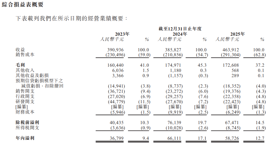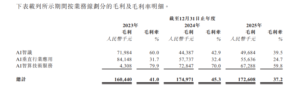 凭借公司的核心AI技术、对应用领域的深刻理解以及务实且高效的商业化能力,公司已于往绩期间实现持续盈利。截至2023年、2024年及2025年12月31日止年度,公司的年内溢利分别为人民币3680万元、人民币6610万元及人民币5870万元。截至2023年、2024年及2025年12月31日止年度,公司的年度经调整纯利(非国际财务报告准则计量指标)分别为人民币3680万元、人民币6610万元及人民币7600万元。2023年、2024年、2025年,公司毛利分别为1.6亿、1.75亿元、1.73亿元;毛利率分别为41%、45.3%、37.2%。