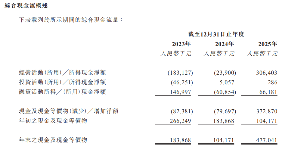 现金流方面,于2023年及2024年,公司分别录得经营现金净流出人民币1.831亿元及人民币2390万元。于2025年,公司录得经营现金净流入人民币3.064亿元。公司于2023年及2024年录得经营现金净流出,乃主要由于AI智算服务业务过程中提供采购代理服务,该服务要求公司在产品交付前代客户预付款项,导致预付款项、按金及其他应收款项、贸易及其他应付款项金额较高。公司已于2025年终止AI智算服务业务下的采购代理服务,故并无录得相关预付款项。因此,公司在2025年录得人民币3.064亿元的营运现金净流入。