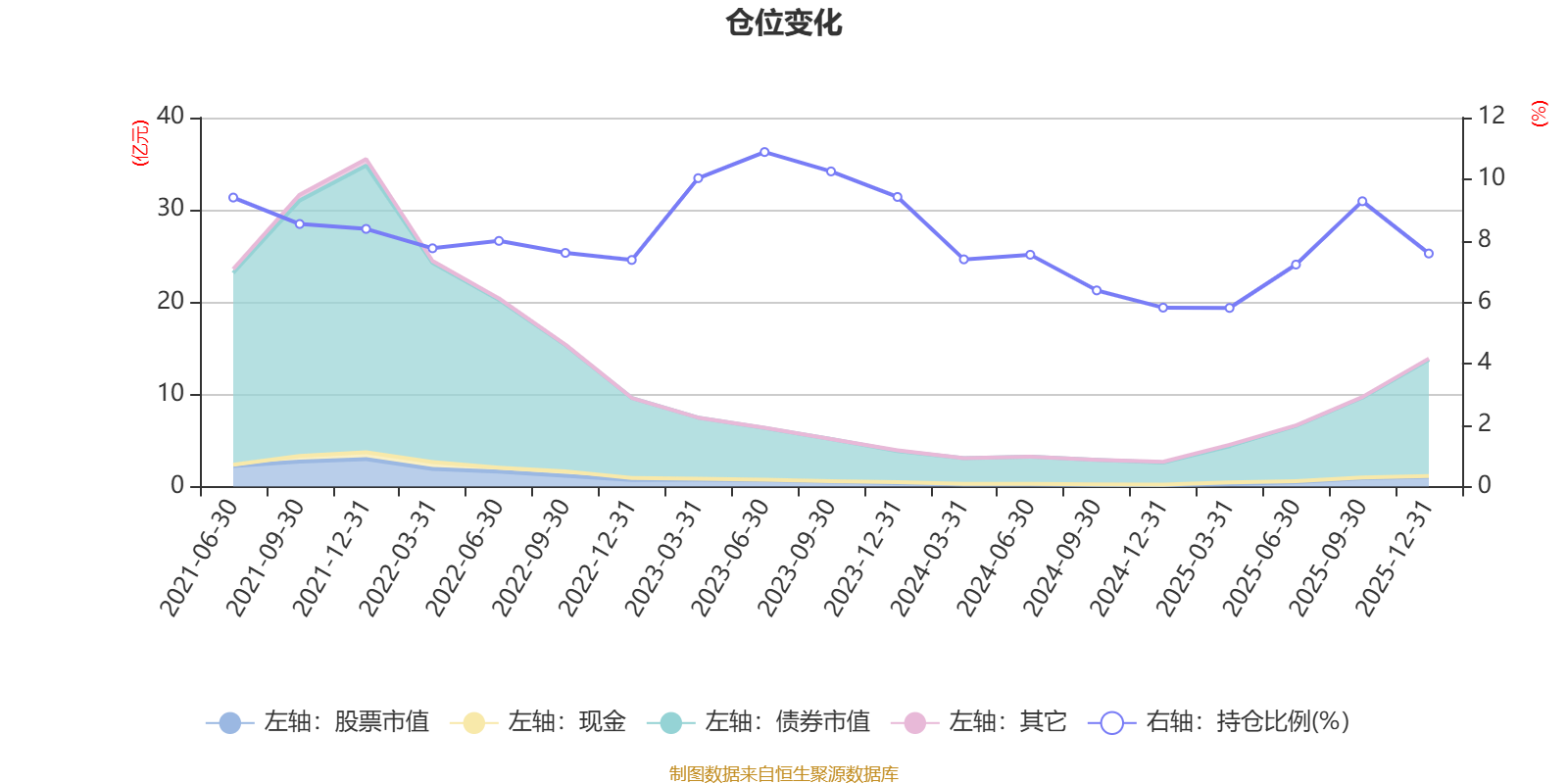 据定期报告数据统计,近三年平均股票仓位为8.13%,同类平均为19.2%。2023年上半年末基金达到10.88%的最高仓位,2025年一季度末最低,为5.81%。