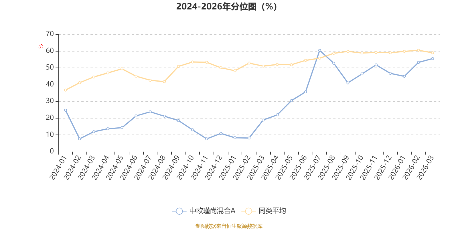 通过所选区间该基金净值增长率分位图,可以观察该基金与同类基金业绩比较情况。图为坐标原点到区间内某时点的净值增长率在同类基金中的分位数。
