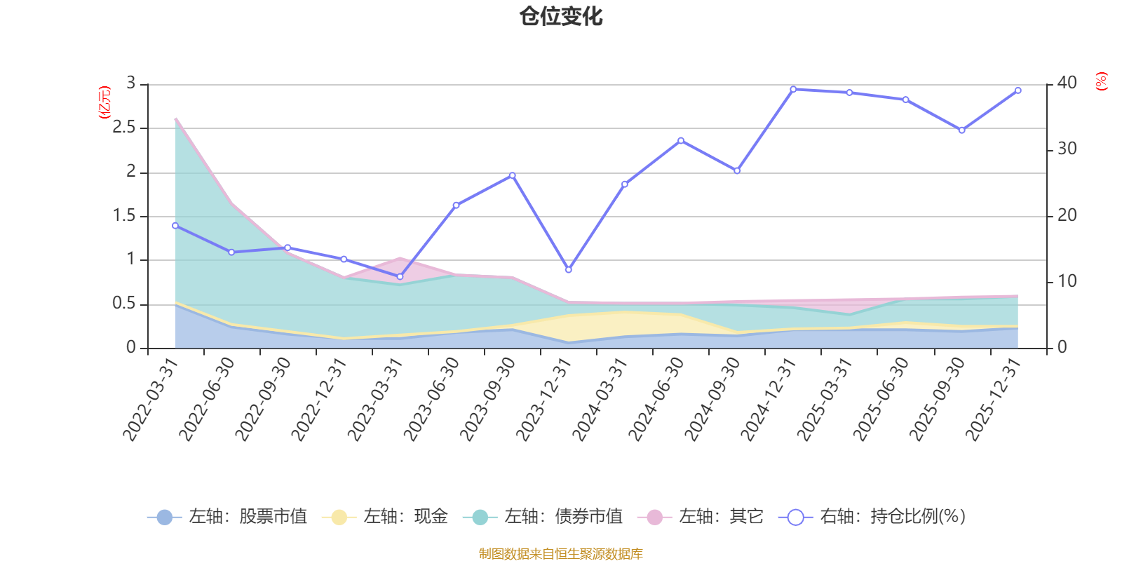 据定期报告数据统计,近三年平均股票仓位为28.45%,同类平均为19.2%。2024年末基金达到39.23%的最高仓位,2023年一季度末最低,为10.84%。