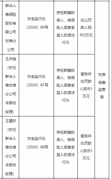 针对以上违法行为,国家金融监督管理总局甘肃监管分局对其处以罚款5万元。对新华人寿甘肃分公司本部总经理王庆临、王建珍,分别警告并处罚款1万元。