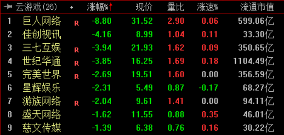 游戏板块集体走低。巨人网络大跌8.8%,三七互娱、世纪华通等多股跌逾3%。