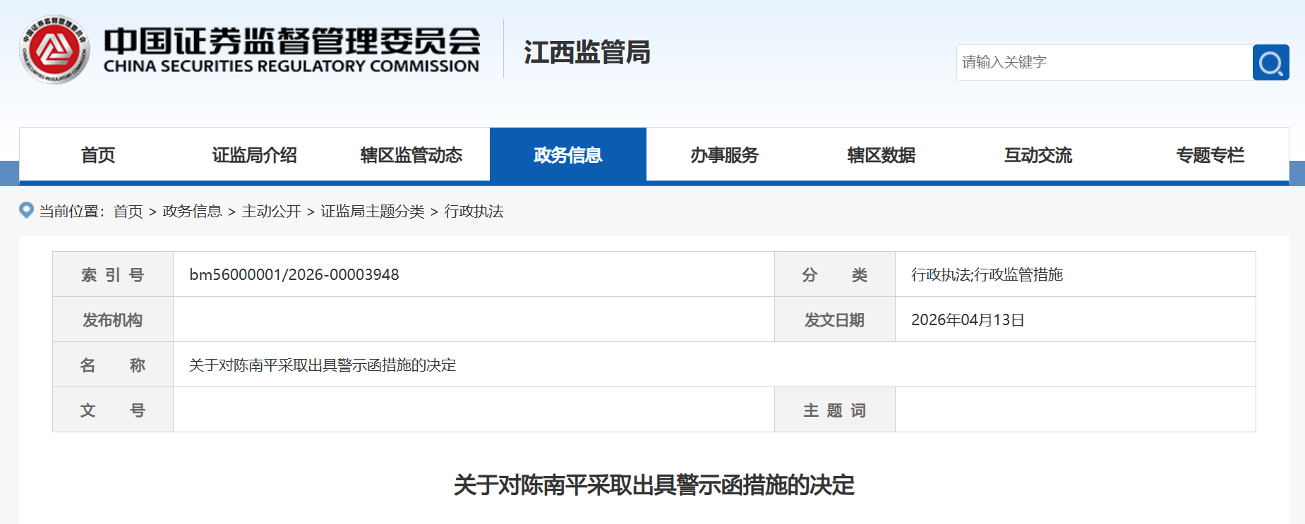 证监局指出,陈南平你作为共青城磐石投资管理合伙企业(有限合伙)执行事务合伙人(委派代表)、负责人,对上述违规行为负有责任,违反了《私募投资基金监督管理暂行办法》第四条第二款的规定。根据《私募投资基金监督管理暂行办法》第三十三条的相关规定,决定对陈南平采取出具警示函的行政监管措施并记入证券期货市场诚信档案。