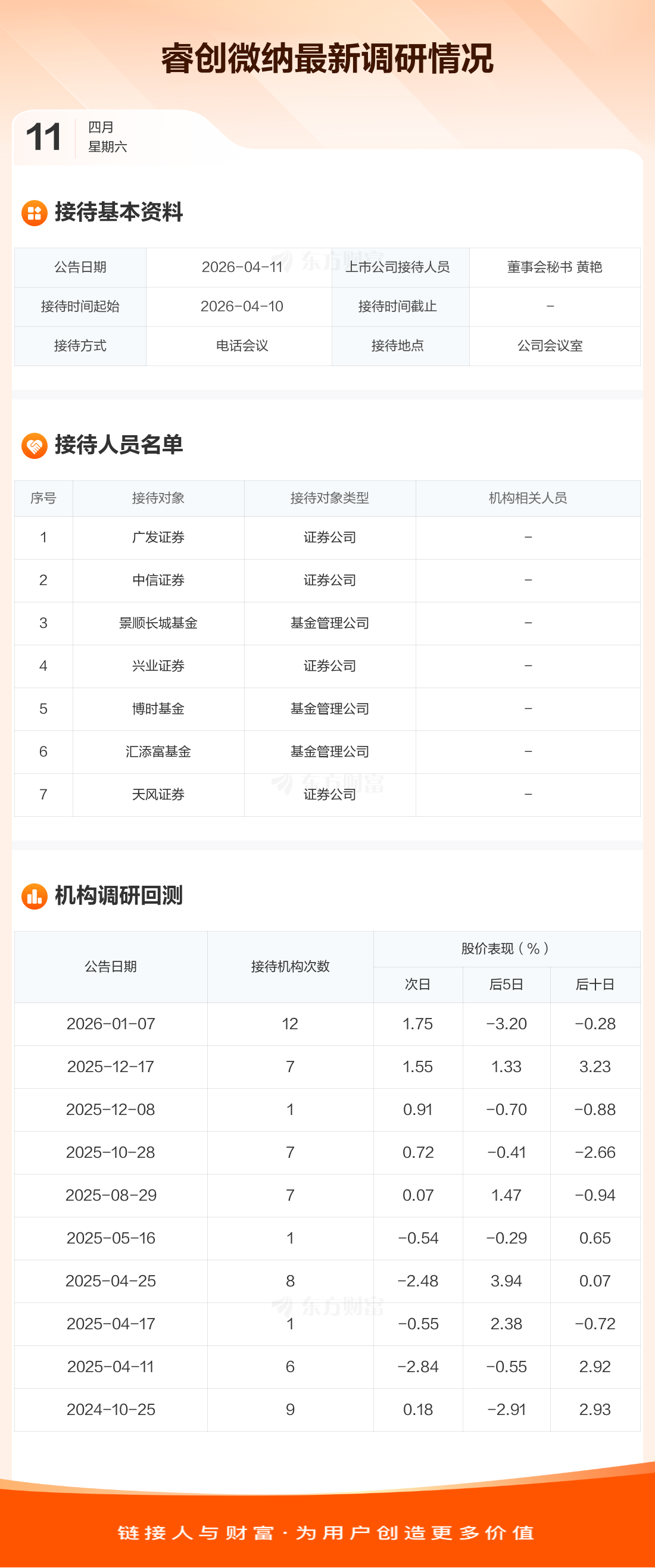 睿创微纳4月11日公告称,4月10日接待广发证券等7家机构调研。接待人员包括董事会秘书 黄艳。