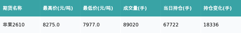 南财智讯4月13日电,盘后期货数据显示,郑州商品交易所的苹果主力合约收跌1.44%,收盘报8071.0元/吨,日内资金流入2.8亿元。其他相关指标见下表: