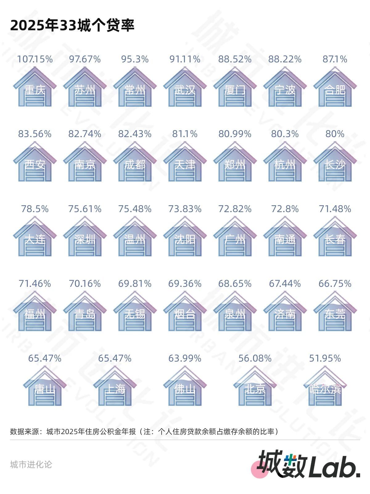 提取率(提取额/缴存额)方面,深圳高达91.06%,资金流动性极强;烟台仅63.11%。值得注意的是,33城中23座城市提取率较上年下降,哈尔滨下降超20个百分点。