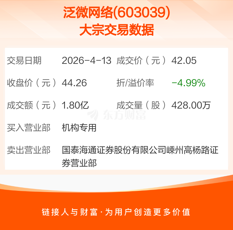 2026年4月13日,泛微网络发生1笔大宗交易,共成交428.00万股,成交金额1.80亿元,占其流通市值比例为1.59%。