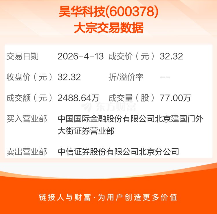 2026年4月13日,昊华科技发生1笔大宗交易,共成交77.00万股,成交金额2488.64万元,占其流通市值比例为0.07%。
