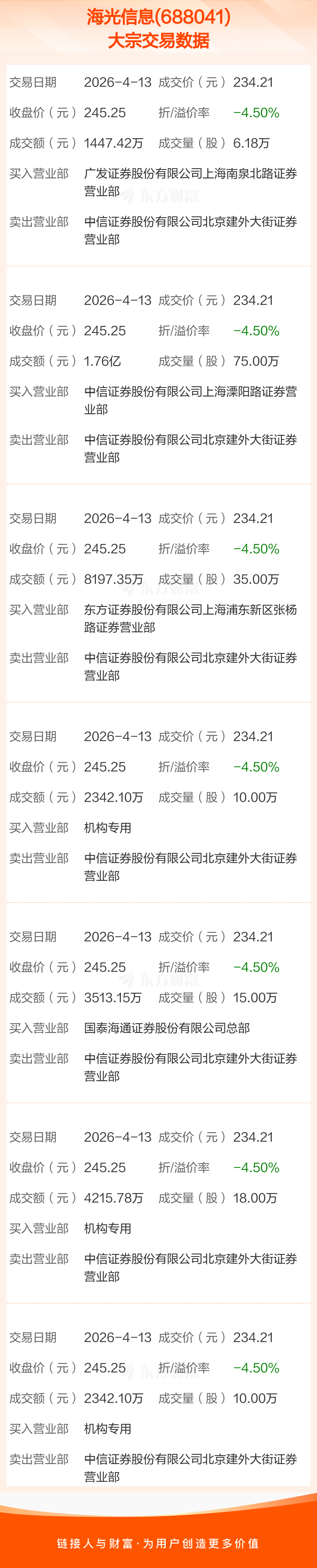 2026年4月13日,海光信息发生7笔大宗交易,共成交169.18万股,成交金额3.96亿元,占其流通市值比例为0.07%。