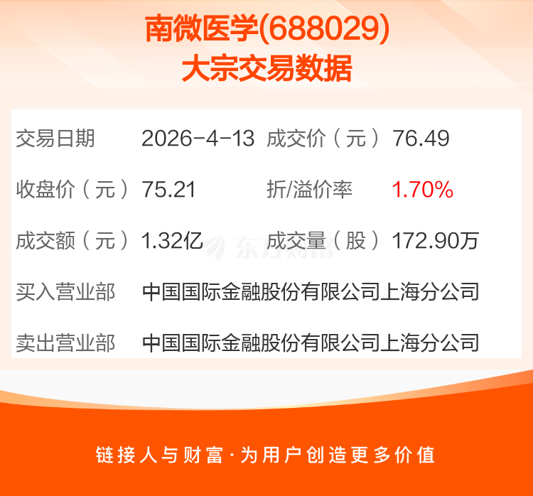 2026年4月13日,南微医学发生1笔大宗交易,共成交172.90万股,成交金额1.32亿元,占其流通市值比例为0.94%。